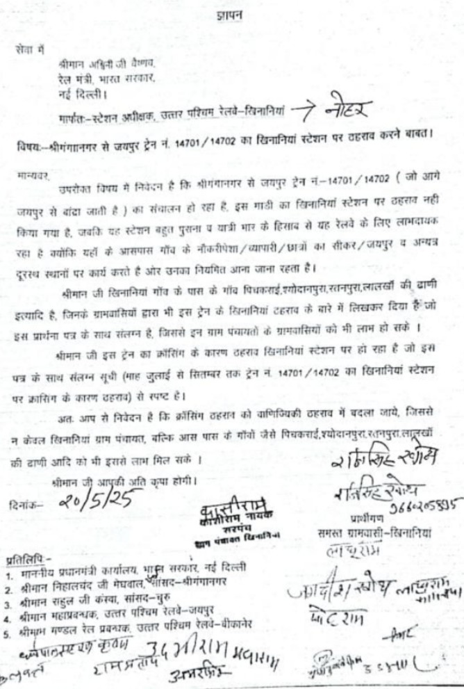 *ग्राम वासियों ने रेलमंत्री के नाम स्टेशन अधीक्षक नोहर को सौंपा ज्ञापन* आर. के. जोश नोहर।उत्तर पश्चिम रेलवे के हनुमानगढ़…