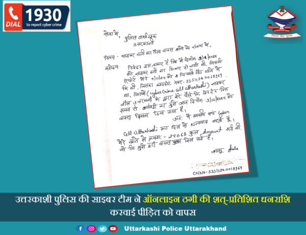 उत्तरकाशी : विगत 9 नवम्बर 2024 को चिन्यालीसौड़ निवासी एक युवती के द्वारा अपने साथ 24,068 रुपये की साइबर धोखाधड़ी…