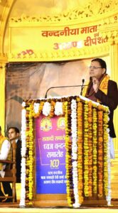 इस अवसर पर मुख्य अतिथि उत्तराखण्ड के मुख्यमंत्री पुष्कर सिंह धामी ने कहा कि यह शताब्दी समारोह माताजी के तपस्वी जीवन, निःस्वार्थ सेवा और अखंड साधना के प्रति राष्ट्र की कृतज्ञता का साक्षात भावात्मक अभिव्यक्ति है। माताजी का संपूर्ण जीवन त्याग, बलिदान और साधना की वह ज्योति है, जिसने असंख्य जीवनों को सही दिशा और नई दृष्टि दी। उन्होंने कहा कि गायत्री परिवार को किसी एक संगठन की सीमाओं में नहीं बाँधा जा सकता, यह उस युग चेतना का वह प्रवाह है, जो व्यक्ति से समाज और समाज से राष्ट्र के उत्थान की ओर अग्रसर करता है।