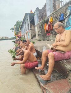 हरिद्वार। प्राचीन सिद्ध हनुमानगढ़ी मंदिर हरिद्वार में श्रावणी उपाकर्म पर्व अनुष्ठान भव्यता सादगी हर्षोल्लास के साथ मनाया गया। प्रात:काल ब्राह्मणों के समूह ने प्रायश्चित हेतु हेमाद्री संकल्प माध्यम से माॅ भागीरथी के पश्चिमी तट राजघाट कनखल में  शास्त्रोक्त विधि से स्नान किया। पुन: मंदिर प्रांगण में सनातन संस्कृति संकल्प बद्ध होकर  ऋषि तर्पण कर आगामी पूर्ण वर्ष धारण करने योग्य यज्ञोपवीत तंतुओं का अनुसंधान किया। प्राच्य विद्याओं के वैज्ञानिक हनुमानगढ़ी मंदिर के आचार्य डा.पं.आनंद बल्लभ जोशी ने भक्त वृंदों को रक्षा धारण कराते हुए कहा कि श्रावणी उपाकर्म आत्मशुद्धि,  वेदों का अध्ययन, ऋषियों के प्रति कृतज्ञता ज्ञापन के साथ साथ सामाजिक सम्बन्ध नैतिक उत्तरदायित्व एवं संस्कृति संस्कार का पर्व है, प्रत्येक द्विज को आज रक्षा बंधन के साथ साथ नूतन यज्ञोपवित धारण, ऋषियों का तर्पण कर संस्कृति का संवर्धन करना चाहिए।